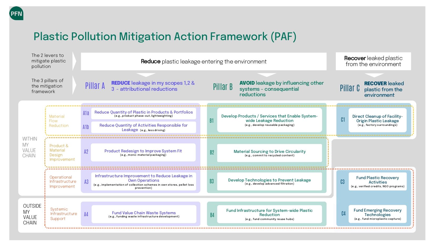 The PAF provides a structured framework to account for plastic mitigation actions taken by companies, both within and beyond their value chain. It draws inspiration from the Net Zero Initiative, adapting its principles to the plastic context.